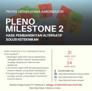 Bogor, April 2025 – Mahasiswa Departemen Teknologi Industri Pertanian (TIN) FATETA IPB University kembali melanjutkan rangkaian kegiatan Proyek Desain Utama Agroindustri (Produta) dengan melaksanakan Milestone 2: Hasil Pembangkitan Alternatif Solusi Keteknikan. Kegiatan ini merupakan bagian penting dalam proses perancangan sistem agroindustri yang berkelanjutan, efisien, dan berorientasi pada pemecahan masalah nyata di lapangan.